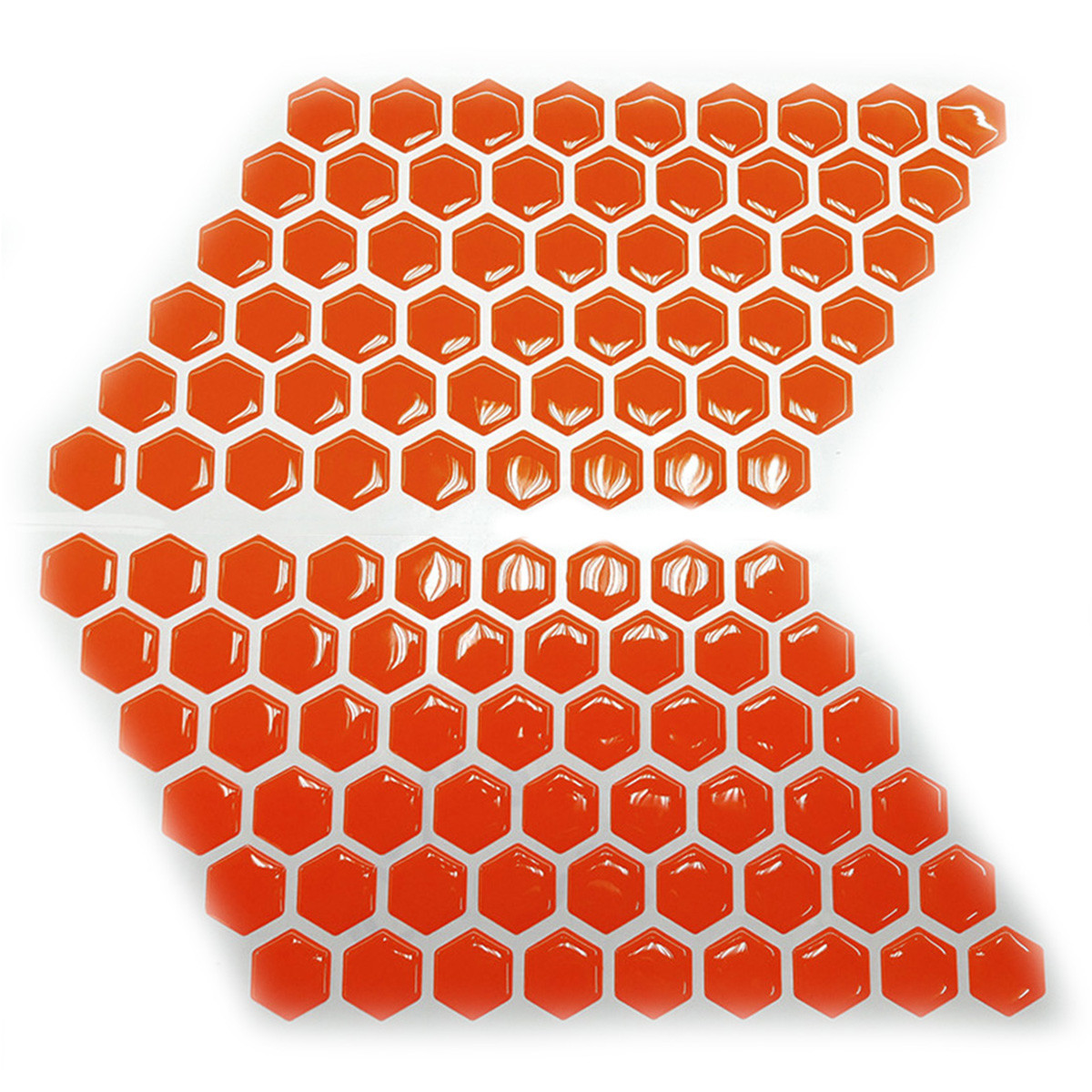 Для зручності використання у кожному комплекті є прозора монтажна плівка. При необхідності ви можете зняти паперову підкладку і приклеїти всі 40 сот одним листом на знежирену поверхню бака, притримуючи за монтажний шар. Потім знімаєте прозору монтажку з наклеєних сот та наносите її на другий лист і повторюєте процедуру. Так ви перенесете всі соти з листа за одну хвилину та збережете інтервали між ними. Також можливе наклеювання кожного стікера окремо вручну.